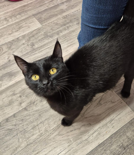 Die hübsche, schwarze Kätzin ist etwa ein Jahr alt, kastriert, gechippt, geimpft und entwurmt.