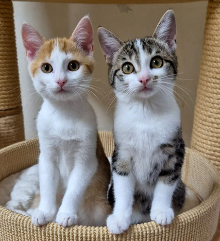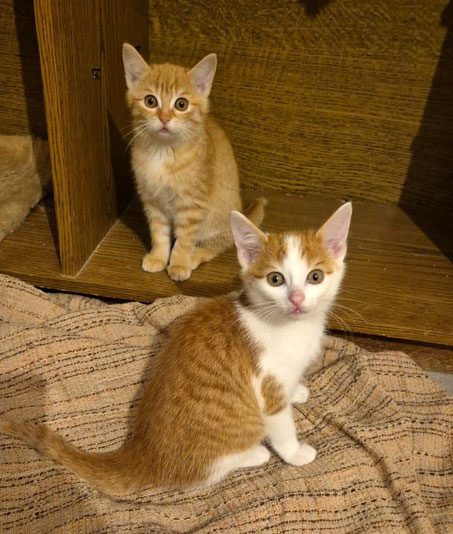 Die beiden zuckersüßen Geschwister Cat (rot, Kätzin) und Cody (rot-weiß, Kater) sind etwa 3 Monate alt und auf der Suche nach einem liebevollen Zuhause, in dem sie gemeinsam groß werden dürfen.
